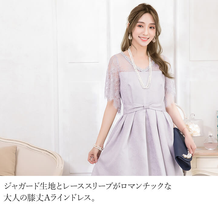 おすすめポイント ■ジャガード生地とレーススリーブがロマンチックな大人の膝丈Aラインドレス。